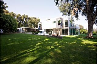 Modern Estate Events Southern California. This unique and beautiful modern estate is located in the Pacific Palisades. This home has stunning ocean views as well as views of the Santa Monica coastline. This property has a spacious lawn for a wedding or special event, along with tall trees. The lighting at this property is ideal and it accentuates the large floor to ceiling windows.