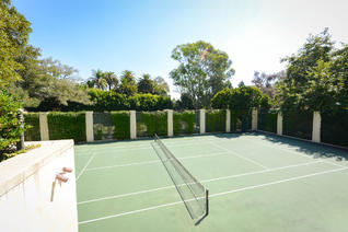 This breathtaking Beverly Hills estate exudes romance and elegance, featuring sprawling lawns, a sparkling swimming pool, a tennis court, and exquisite architecture.