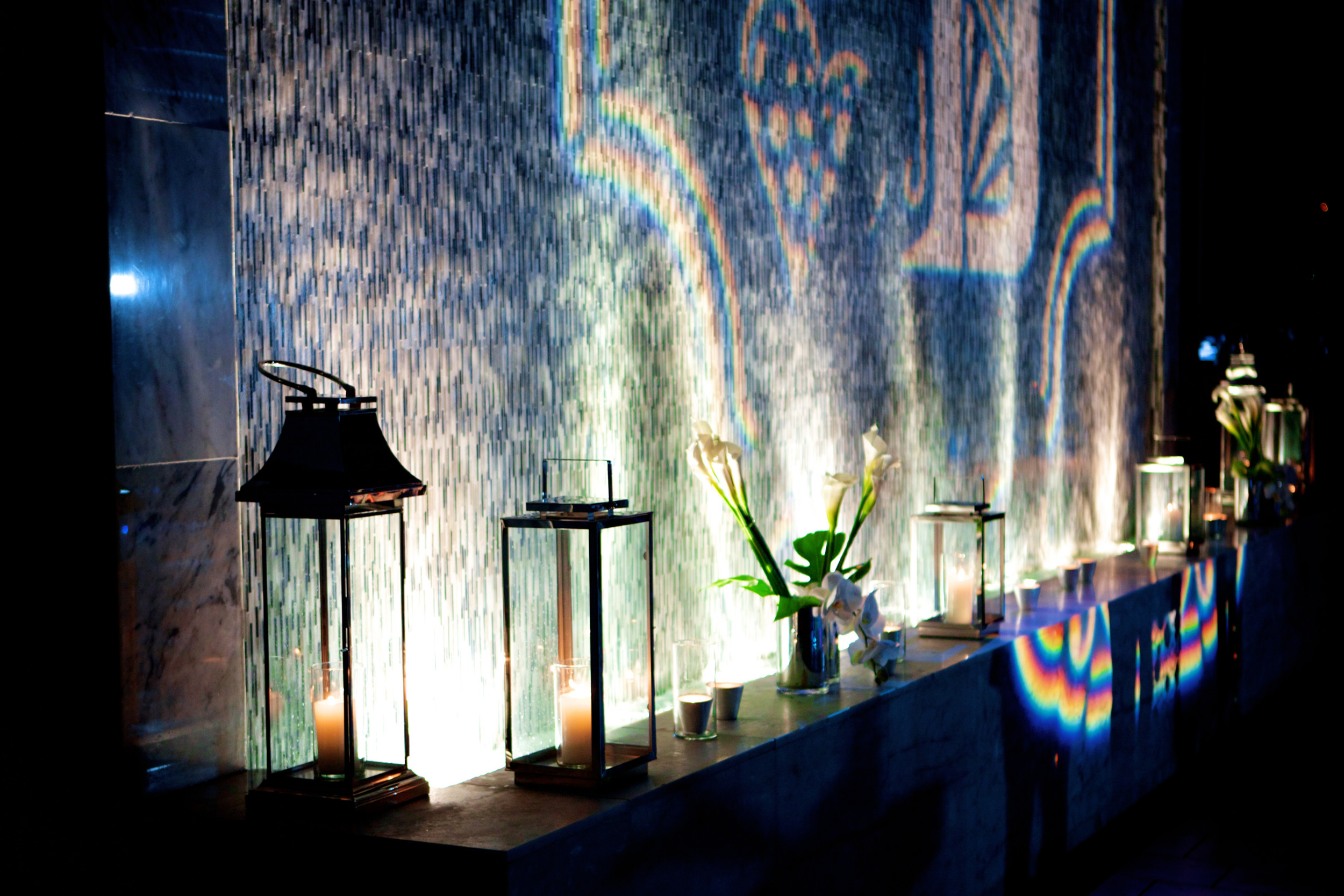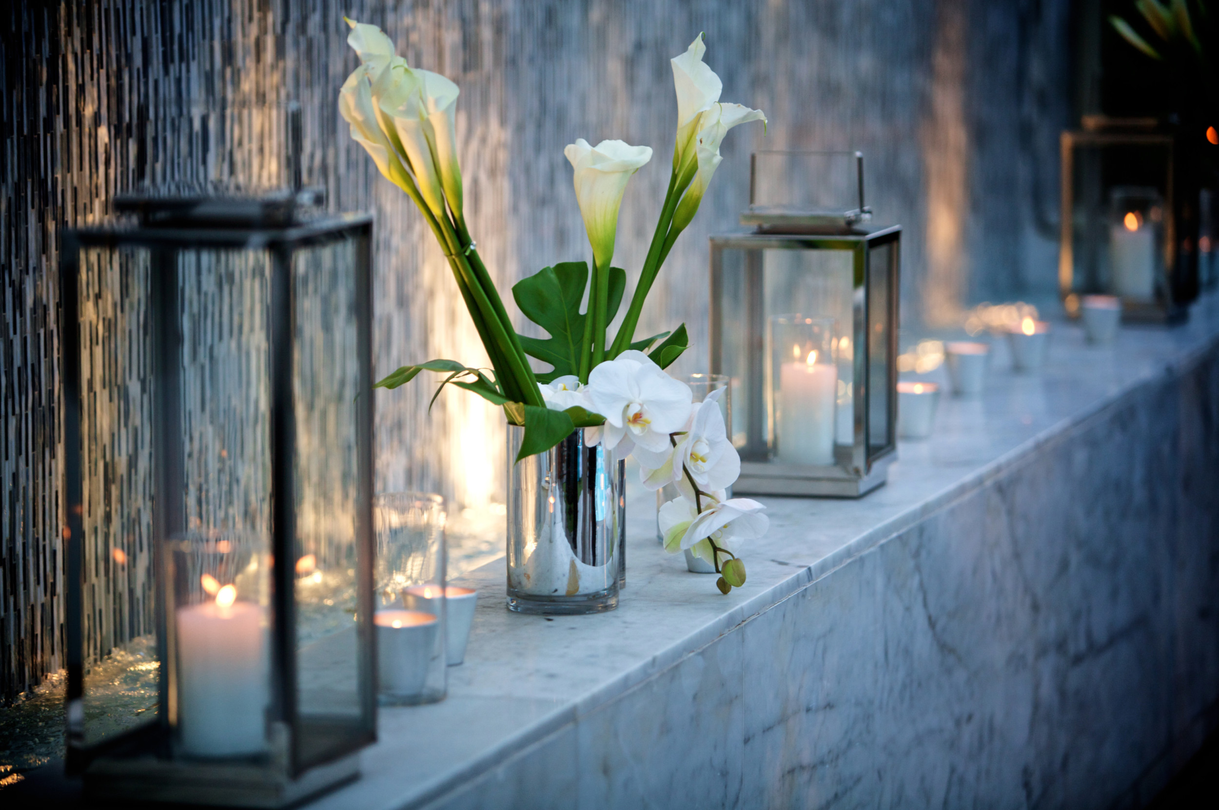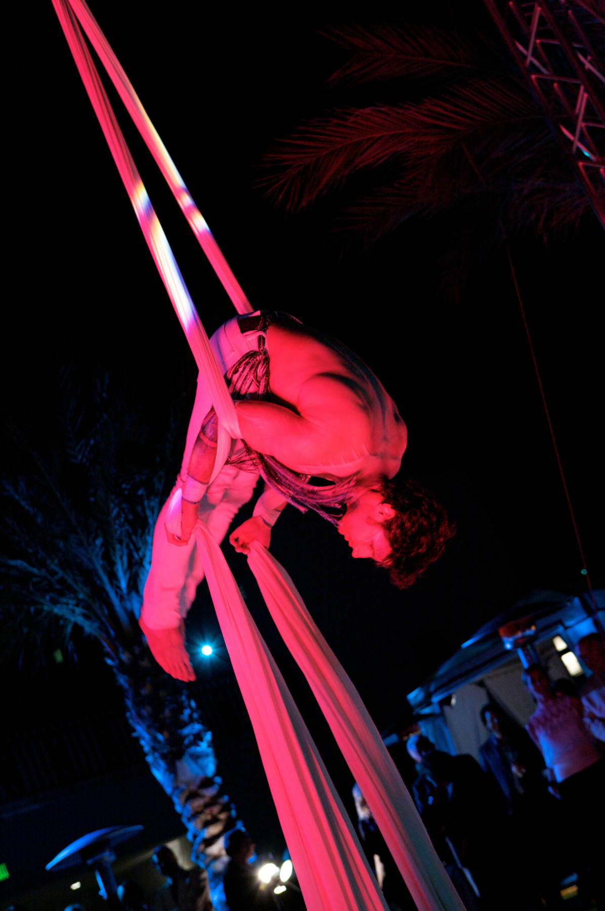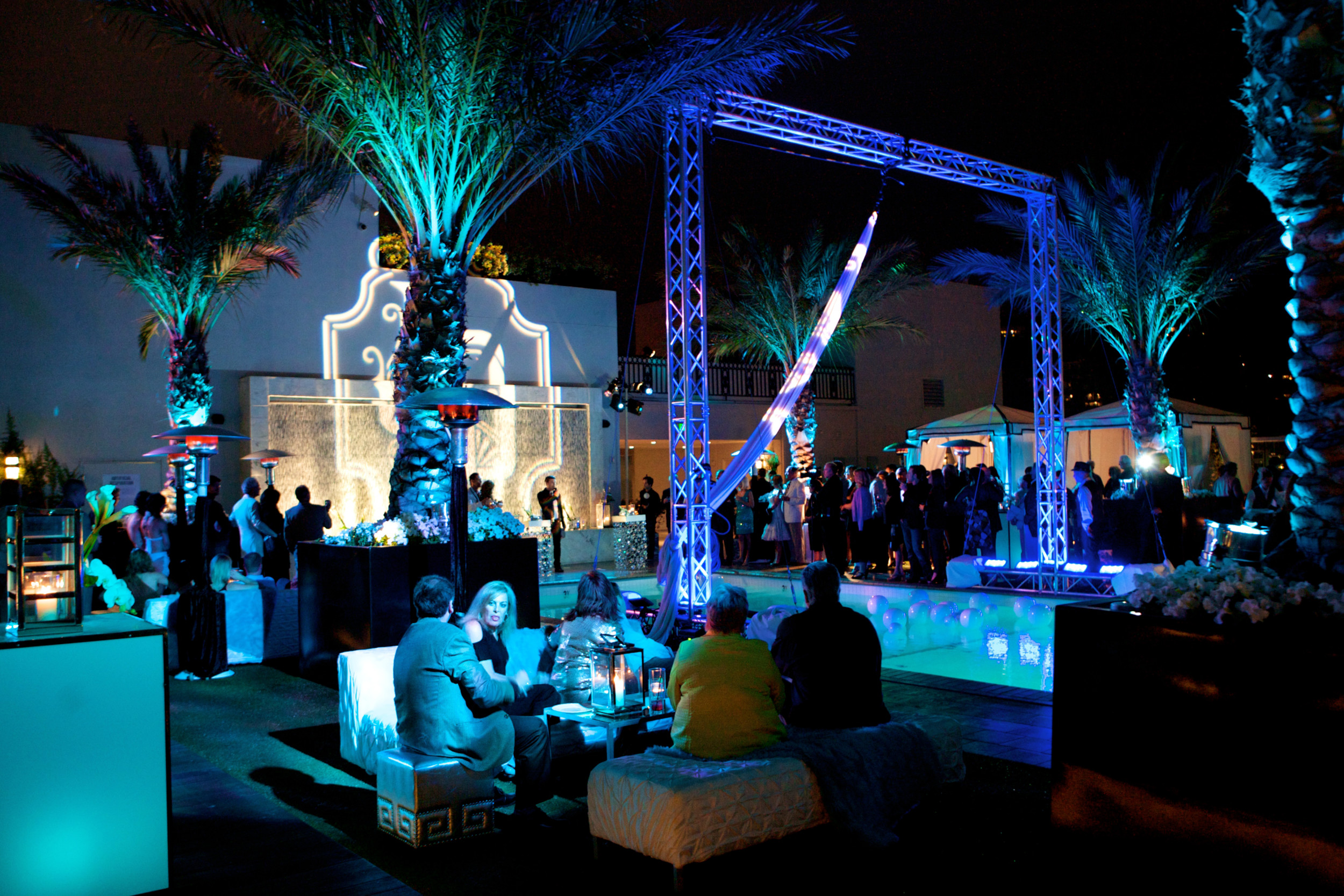 Stunning roof top rehearsal dinner at the London Hotel in West Hollywood overlooking the Los Angeles Sunset Strip.  The guests were entertained by talented and beautiful acrobats who performed amazing acrobatics over the swimming pool as they were suspended from the truss we had built over the pool.